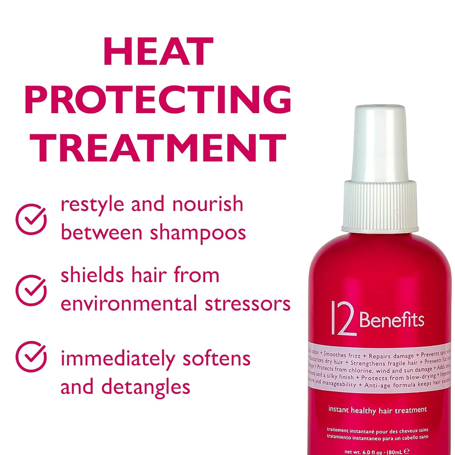 12 Benefits Instant Healthy Hair Treatment - Leave In Conditioner Spray with Quaternium 39 and Silk Fibre Protein - Smooths Frizz, Strengthens & Repairs Damaged Hair - Made in the USA, (6 Fl Oz)