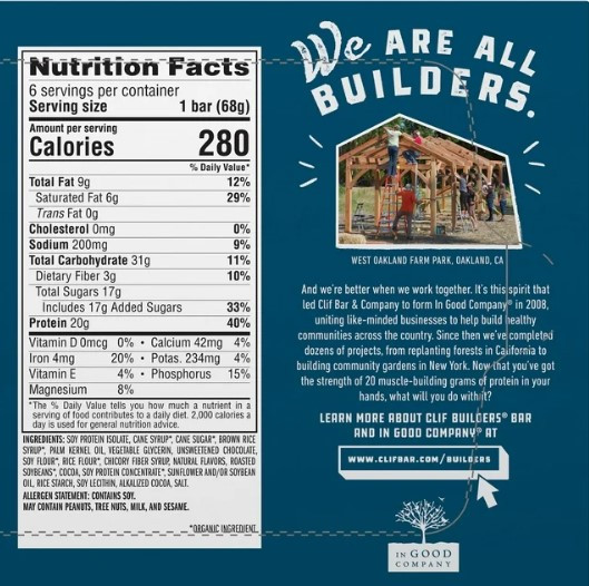 CLIF Builders are made to fuel hardworking bodies after tough workouts, whether you?re at the gym, on the court, or on the track. Packed with 20g complete plant protein*, including essential amino acids, our bars work as hard as you do. CLIF Builders are also non-GMO, gluten free, and low glycemic, with no high-fructose corn syrup or artificial flavors. *See nutrition for saturated fat content.