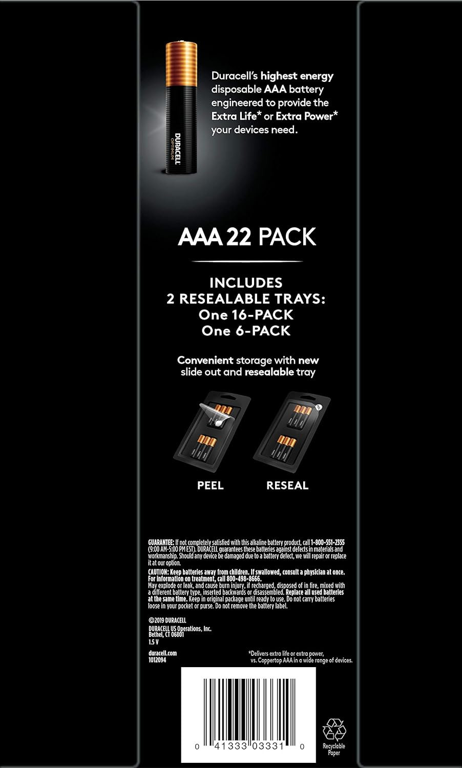 The most revolutionary breakthrough from Duracell to date. The Duracell Optimum Batteries come in a brand-new slider pack with a resealable storage tray, making it easier to keep your batteries organized and out of disarray. We are pleased to provide you the Duracell 1.5-Volt Optimum Alkaline AAA batteries, which are a part of the reliable Duracell battery range. Duracell is the most trusted battery brand. *In a variety of gadgets, Coppertop AAA vs. Extra Life or Extra Power.