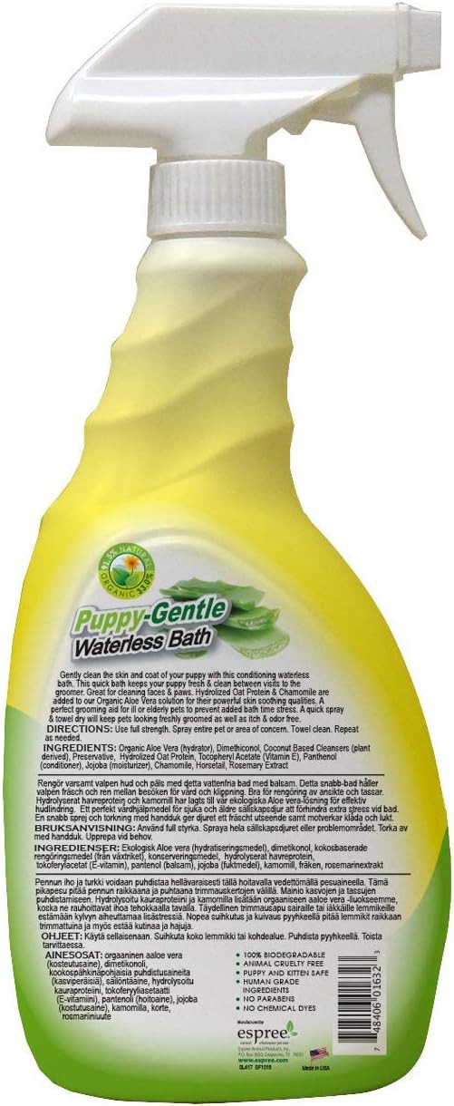 Gently clean the skin and coat of your puppy with this conditioning waterless bath. This quick bath keeps your puppy fresh & clean between visits to the groomer. Great for cleaning faces & paws. Hydrolyzed Oat Protein & Chamomile are added to our Organic Aloe Vera solution for their powerful skin soothing qualities. A perfect grooming aid for ill or elderly pets to prevent added bath time stress. A quick spray & towel dry will keep pets looking freshly groomed as well as itch & odor free. INGREDIENTS: Organic Aloe Vera (hydrator), Dimethiconol, Coconut Based Cleansers (plant derived), Preservative, Hydrolyzed Oat Protein, Tocopheryl Acetate (Vitamin E), Panthenol (conditioner), Jojoba (moisturizer), Chamomile, Horsetail, Rosemary Extract.