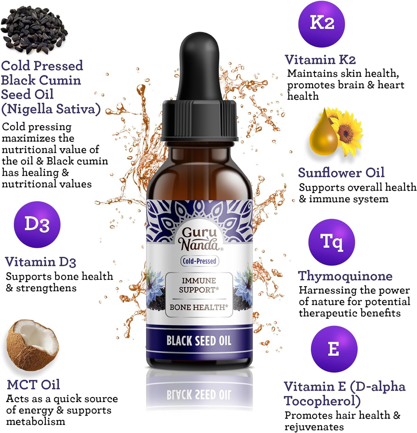 This multipurpose GuruNanda Black Seed oil is made from the herb Nigella sativa, often known as "Kalonji," which is used to boost the body's natural defenses. Richly enhanced by the goodness of Vitamins D and K2, this powerful combination optimizes health benefits such as immune support, bone health, and gastrointestinal health.