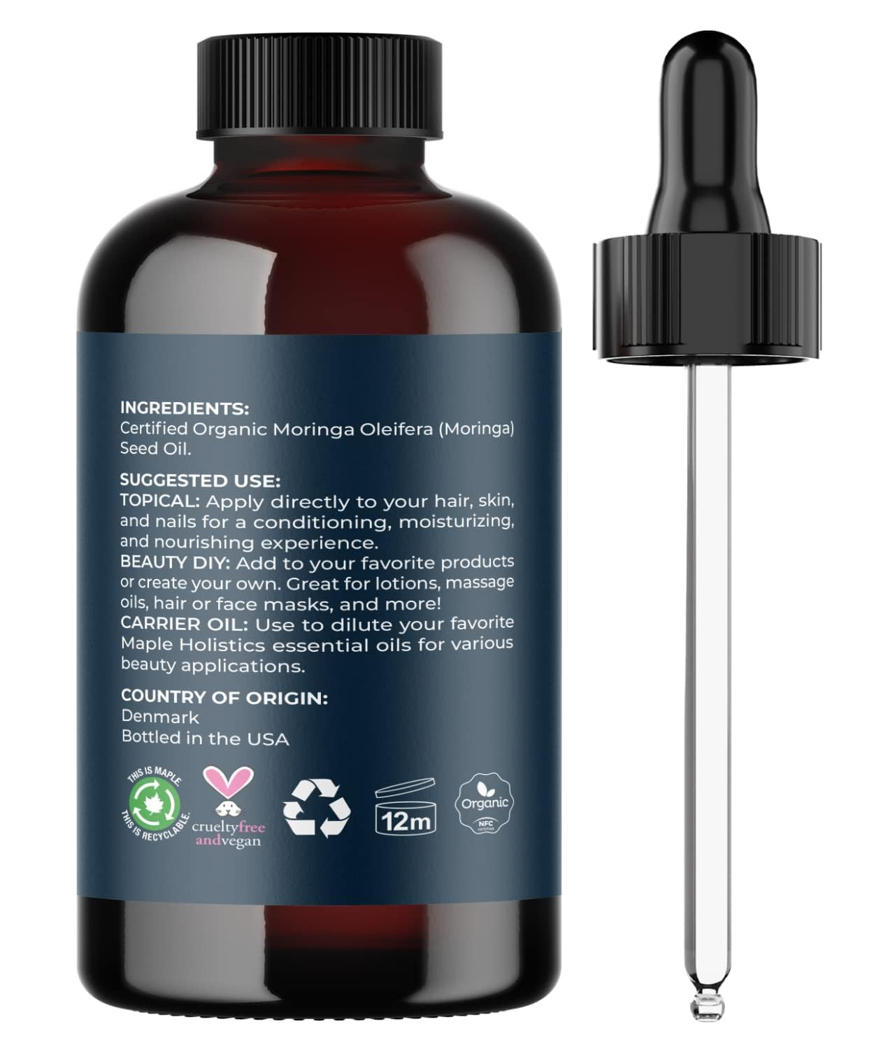 Moringa oil for face, rich in oleic acid and vitamin E oil, can work wonders as a hydrating face oil for dry skin and nourishing skin oil for anti aging face care.