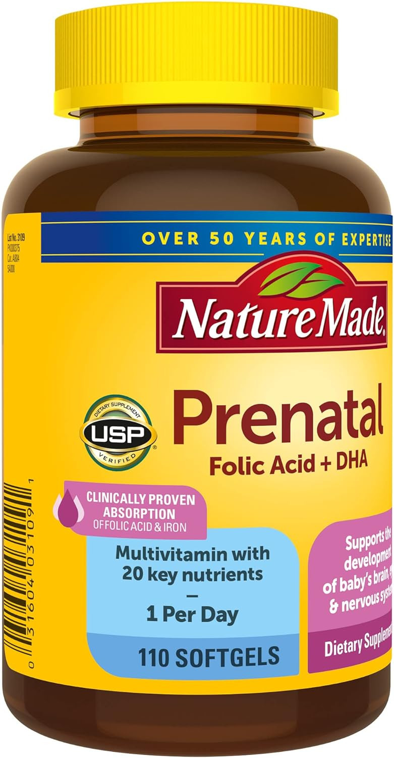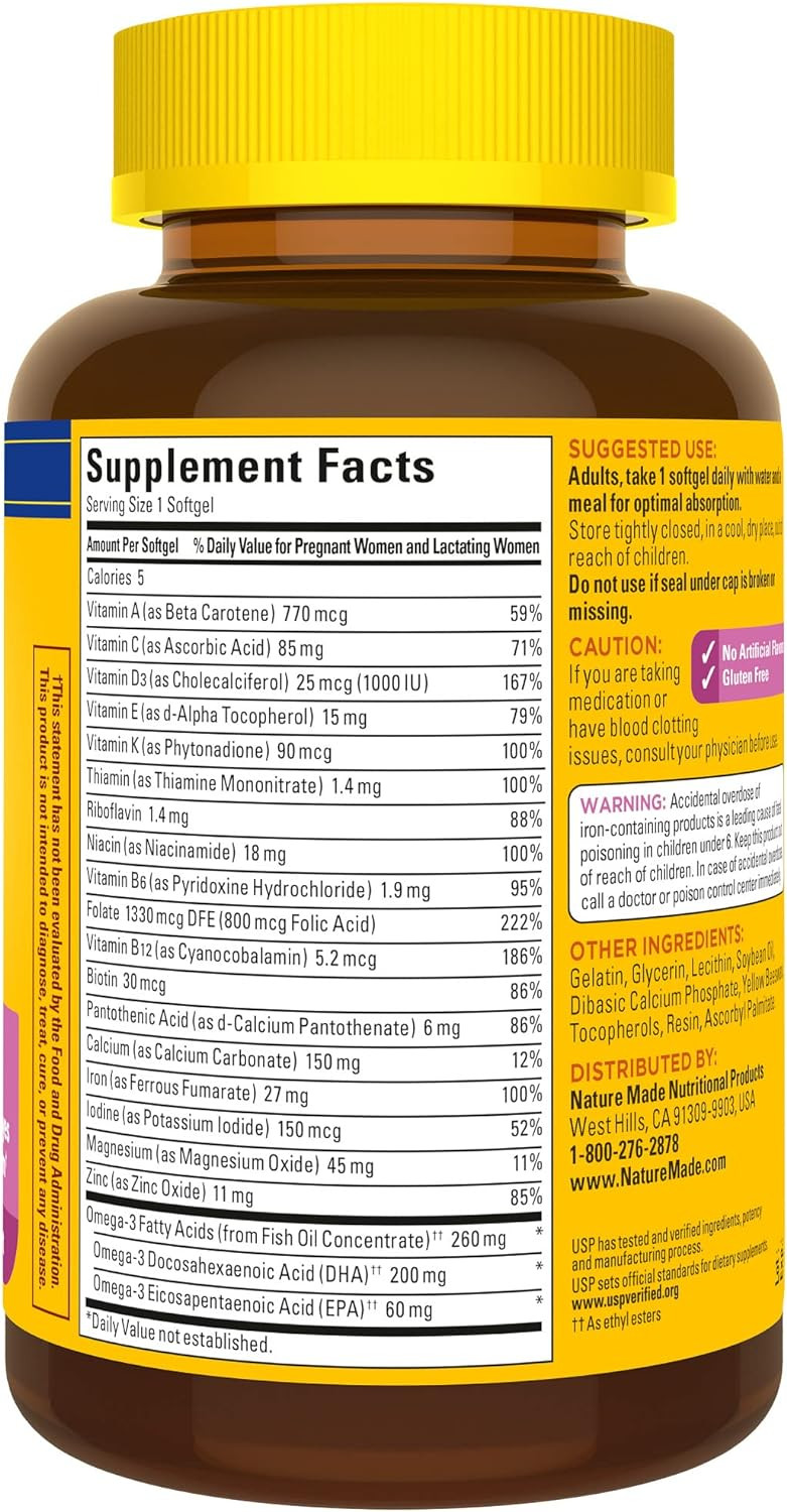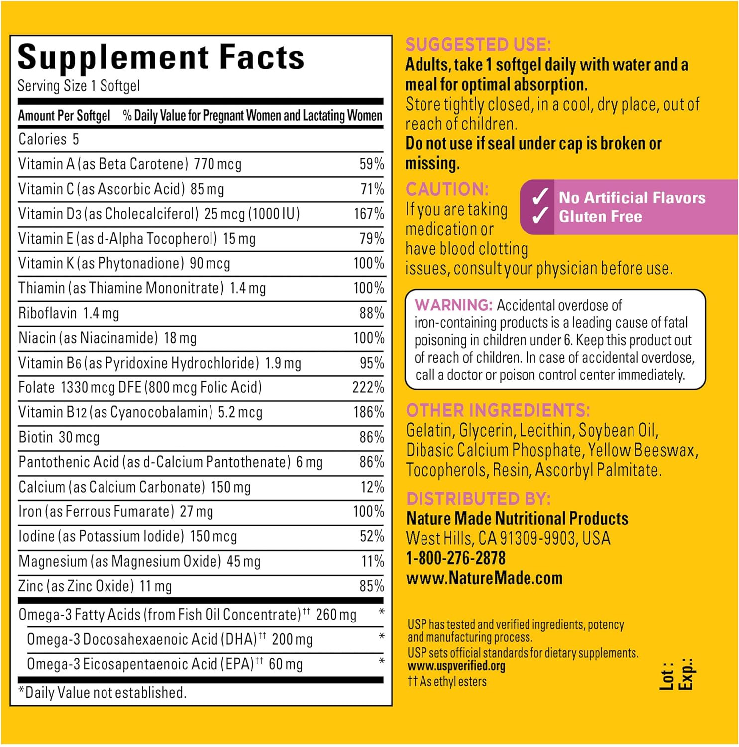Prenatal multivitamins Nature Made Prenatal with Folic Acid and DHA Softgels are specifically designed to support a baby's brain, nervous system, bones, and eyes while also supporting the health of the mother. This dietary supplement, a gluten-free multivitamin for women, is made from premium ingredients and has no artificial flavors. Together with 19 other nutrients, including 200 mg of DHA, an Omega-3 essential for mother health and baby development, this Nature Made Prenatal multivitamin supplement for women also contains folic acid. Vitamins A, C, D, E, and K are also present in Nature Made Prenatal with Folic Acid + DHA Softgels, along with all eight B vitamins. Clinical studies have demonstrated the clinically proven absorption of Folic Acid and DHA in this Nature Made women's multivitamin prenatal supplement.