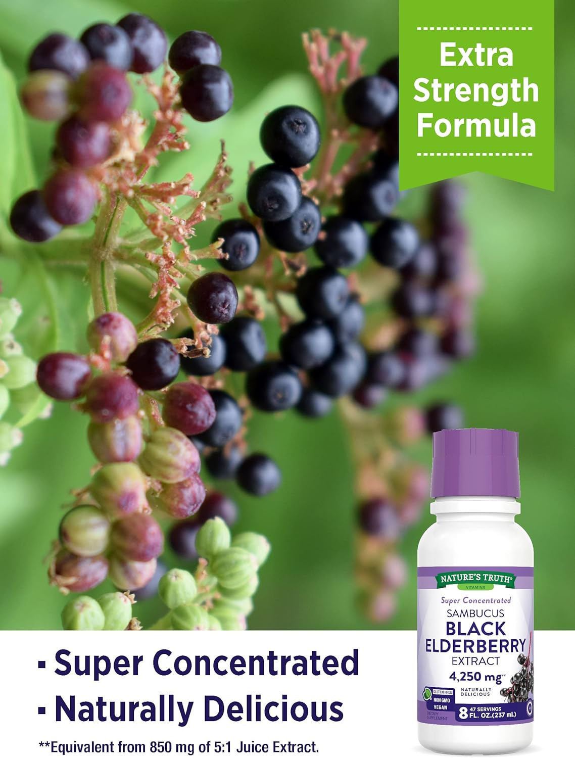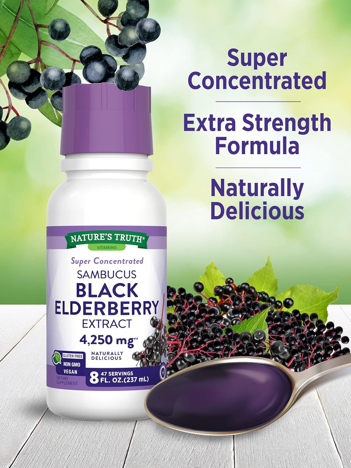Nature's Truth Black Elderberry (Sambucus nigra) formula is a non-GMO supplement, packaged and lab tested for quality in the USA. Our great tasting, super concentrated extract is now free of common allergens, including gluten, lactose, milk, yeast, wheat, artificial sweetener, and artificial flavor. Adults should consult a medical professional before use if pregnant or taking any medicine. Keep out of reach of kids and babies.
