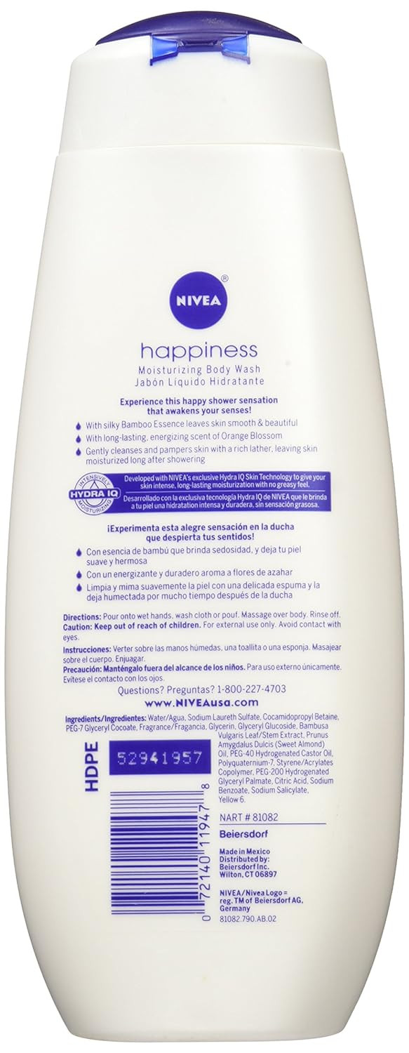 Feel the uplifting sensation and energizing scent that this nourishing NIVEA Body Wash provides for you and your skin. This silky cream-wash with nourishing Bamboo Essence provides incredibly long-lasting soft and supple skin while gently cleansing and rinsing. Its decadent lathering formula is infused with an energizing Orange Blossom scent to awaken your senses and leave you feeling refreshed and confident. Developed with NIVEA's breakthrough Hydra IQ Technology to provide intense long-lasting moisturization to your skin throughout the day, even after you've left the shower. For smooth, touchably beautiful skin and film-free skin!