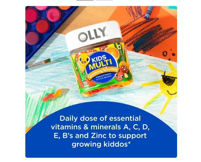 Wiggle away! OLLY Kids Multi Gummy Worms are playful nutrient-packed gummies made with a complete blend of daily vitamins and minerals to help kiddos thrive and promote overall wellness.These OLLY Kids Vitamins deliver a daily dose of key vitamins and minerals A, C, D, E, Bs and Zinc to support growing kiddos and fill the gaps when eating habits are less than perfect (because let’s face it, not all wiggle worms love to eat their veggies!). The chewable daily vitamin comes in a delicious Sour Fruity Punch flavor.Good health is at the center of everything we do. That's why we’ve made it our mission to make nutrition easy to understand. We do it by crafting products that are as effective as they are delicious—because we know when something feels good, you’re more likely to do it.**These statements have not been evaluated by the Food and Drug Administration. This product is not intended to diagnose, treat, cure or prevent any disease.