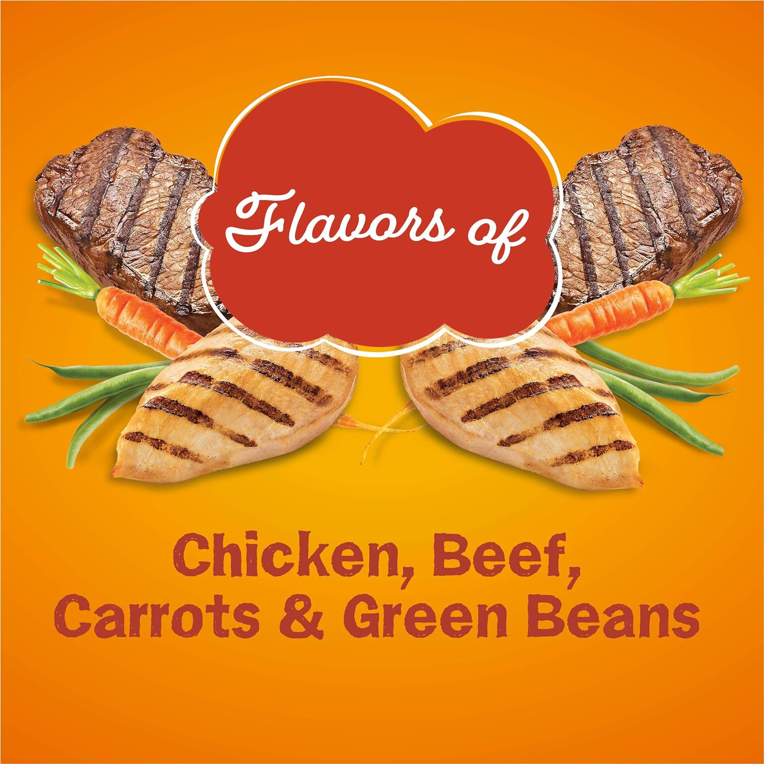 Ground Yellow Corn, Corn Gluten Meal, Wheat, Chicken By-Product Meal, Ground Soybean Meal, Beef Tallow Preserved with Mixed-Tocopherols, Meat and Bone Meal, Glycerin, Animal Liver Flavor, Chicken, Phosphoric Acid, Salt, Calcium Carbonate, Turkey By-Product Meal, Malted Barley Extract, Potassium Chloride, Choline Chloride, Dried Carrots, Dried Green Beans, Taurine, L-Lysine Monohydrochloride, Zinc Sulfate, Ferrous Sulfate, DL-Methionine, Vitamin E Supplement, Yellow 6, Manganese Sulfate, Yellow 5, Red 40, Niacin, Copper Sulfate, Blue 2, Vitamin A Supplement, Calcium Pantothenate, Thiamine Mononitrate, Riboflavin Supplement, Vitamin B-12 Supplement, Pyridoxine Hydrochloride, Folic Acid, Vitamin D-3 Supplement, Calcium Iodate, Biotin, Menadione Sodium Bisulfite Complex (Source of Vitamin K Activity), Sodium Selenite. F-6004.