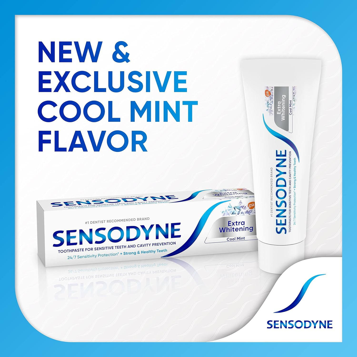 Sensodyne Extra Whitening Cool Mint Sensitive Teeth Whitening and Cavity Prevention Toothpaste is a daily protection toothpaste for sensitive teeth that is free of SLS and helps eliminate stains for a whiter look. With twice-daily brushing, this potassium nitrate and sodium fluoride toothpaste helps whiten teeth by removing surface stains and working deep within teeth to create calming protection around the nerves. This can reduce sensitivity in as little as two weeks. In addition to providing all the antibacterial and fresh breath benefits of conventional Sensodyne toothpaste, Sensodyne Extra Whitening Cool Mint toothpaste has a composition that lessens tartar accumulation for teeth that are cleaner, smoother, and healthier. Use this whitening sensitive toothpaste in the morning and evening to experience relief from sensitivity and protection around-the-clock. Obtain long-lasting defense.