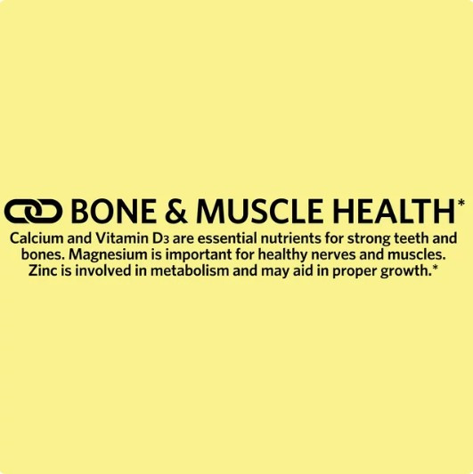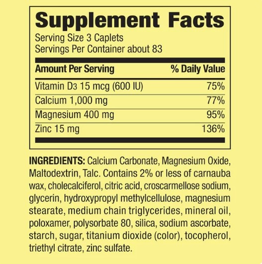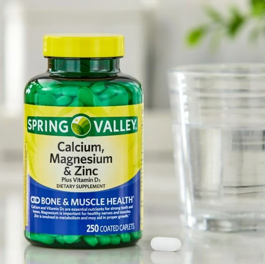 Our Spring Valley Calcium, Magnesium & Zinc Plus Vitamin D3 Coated Caplets are formulated to support bone and muscle health.* Calcium and vitamin D3 are essential nutrients for strong teeth and bones, magnesium is important for healthy nerves and muscles, and zinc is involved in metabolism and may aid in proper growth.* One serving size of three caplets delivers 1,000 milligrams of calcium, 400 milligrams of magnesium, 15 milligrams of zinc, and 15 micrograms (600 IU) of vitamin D3. This formula contains no gluten, lactose, artificial dyes or flavors. You can rest assured that Spring Valley Calcium, Magnesium & Zinc Plus Vitamin D3 Coated Caplets are produced with strict quality guidelines and backed by our quality guarantee.