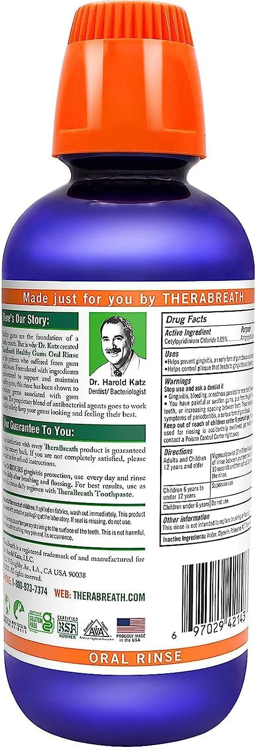 Fifty percent of adult Americans have gum disease, according to the CDC. Gums that are sensitive or bleed are signs of gum disease. Gum disease that is advanced enough can cause tooth loss. Thankfully, TheraBreath Healthy Gums Mouthwash helps you maintain your perfect teeth by lowering the risk of gum disease and bleeding gums. This mouthwash helps manage the plaque that causes gingivitis and bleeding gums. It is enhanced with CPC, an FDA-approved chemical that has been clinically shown to help combat gingivitis. Periodontists recommend using CPC. Dentist-formulated, alcohol-free TheraBreath Healthy Gums Mouthwash helps freshen breath without burning or irritating. We are so sure that TheraBreath Oral Rinses work that we stand behind them with a 100% guarantee