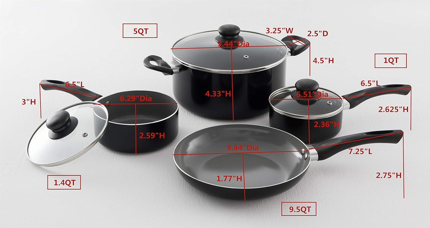 This cookware set is perfect for all types of cooking, and includes 1 Quart Sauce Pan, 1.4 Quart Sauce Pan, 5 Quart Dutch Oven, and a Fry Pan.