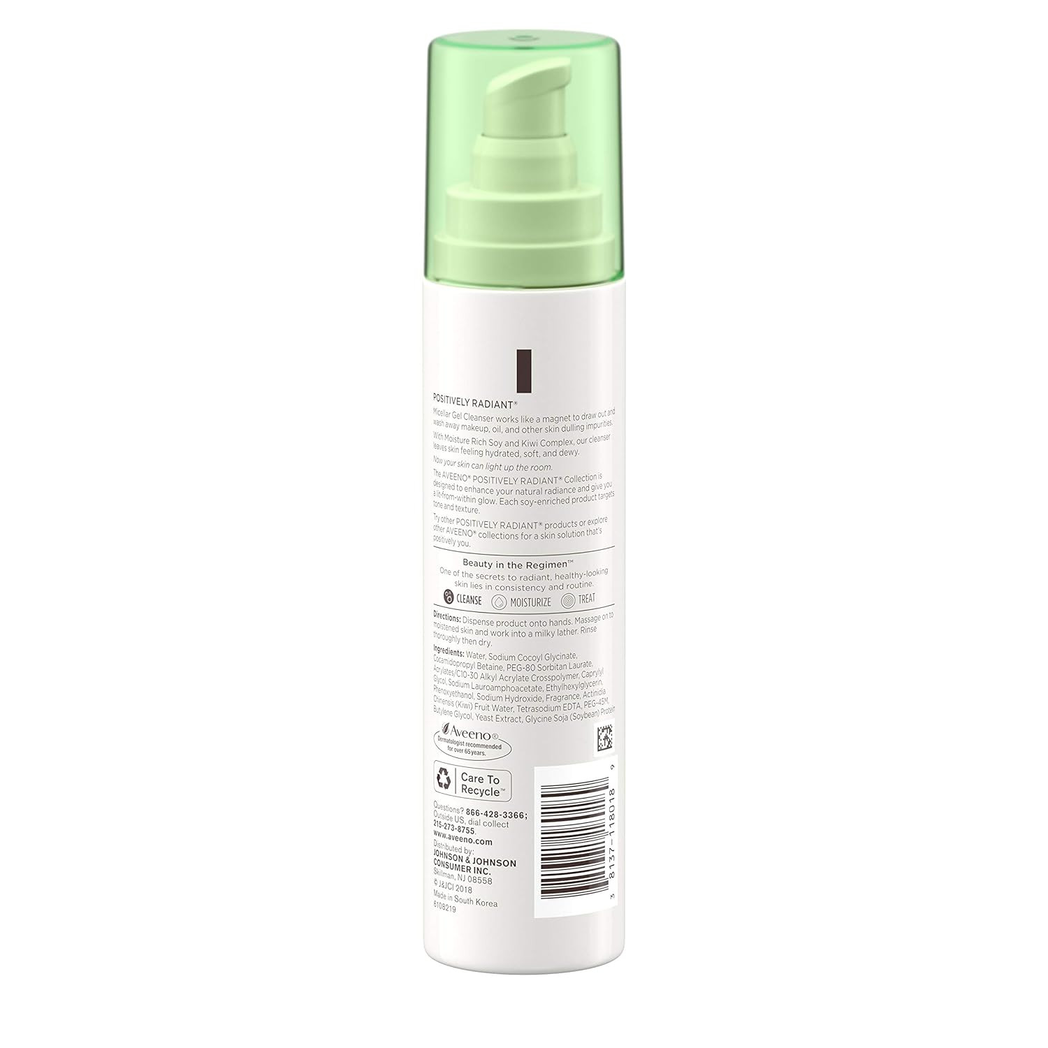 5.1-fluid ounce bottle of Aveeno Positively Radiant Micellar Gel Cleanser with Moisture -Rich Soy & Kiwi Complex gently cleanses and leaves skin feeling hydrated