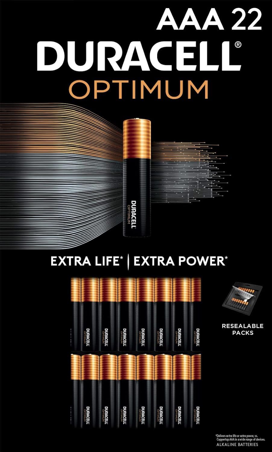 The most revolutionary breakthrough from Duracell to date. The Duracell Optimum Batteries come in a brand-new slider pack with a resealable storage tray, making it easier to keep your batteries organized and out of disarray. We are pleased to provide you the Duracell 1.5-Volt Optimum Alkaline AAA batteries, which are a part of the reliable Duracell battery range. Duracell is the most trusted battery brand. *In a variety of gadgets, Coppertop AAA vs. Extra Life or Extra Power.