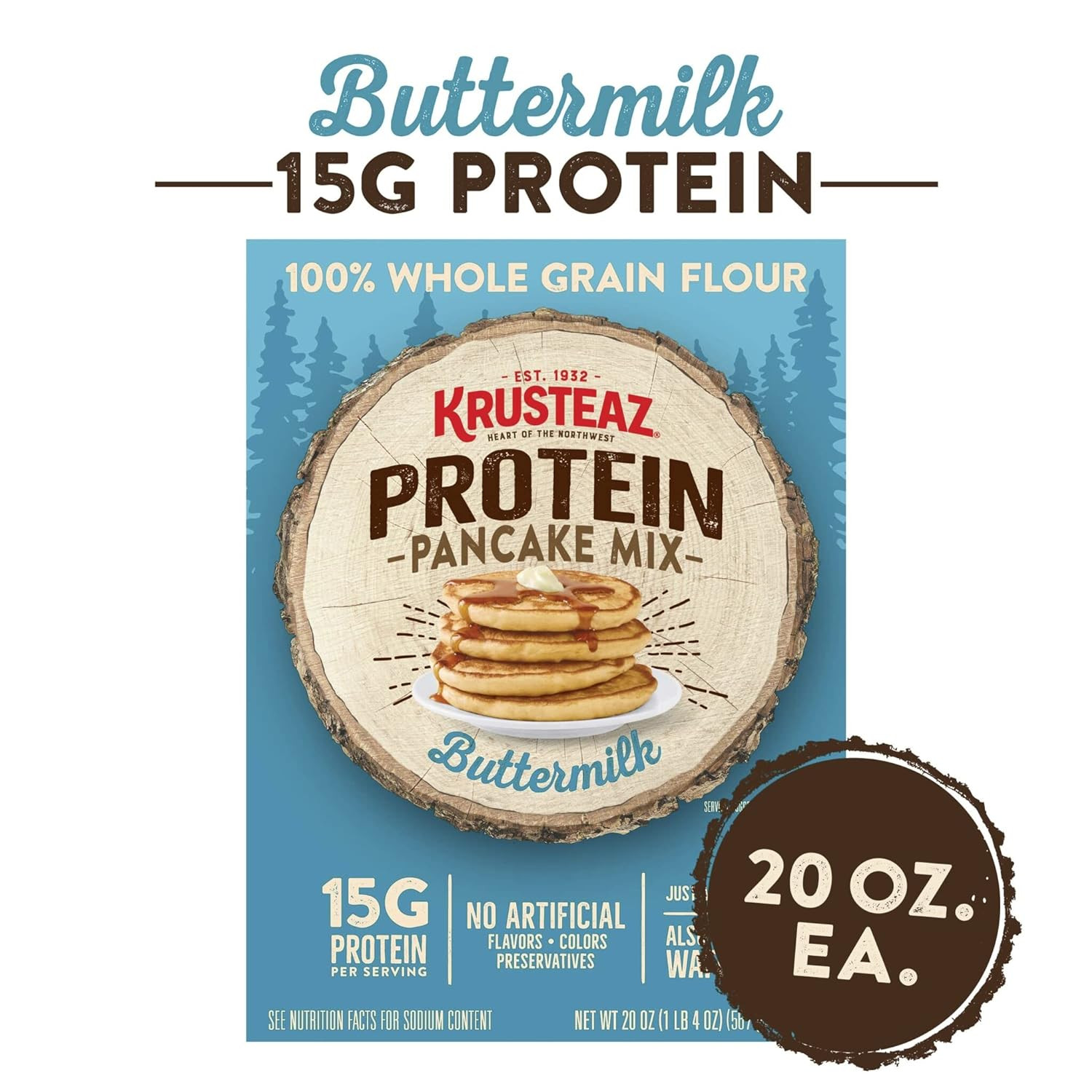 Here's a stack of pancakes that will keep you full but not sluggish. Krusteaz Protein Pancake Mix, with 15 grams of protein per serving and 100% whole grain flour, means a high-energy breakfast, brunch, or dinner. And it's easy to make. Simply add water to the batter and cook until the pancakes are golden brown. This order consists of two 20-ounce boxes.