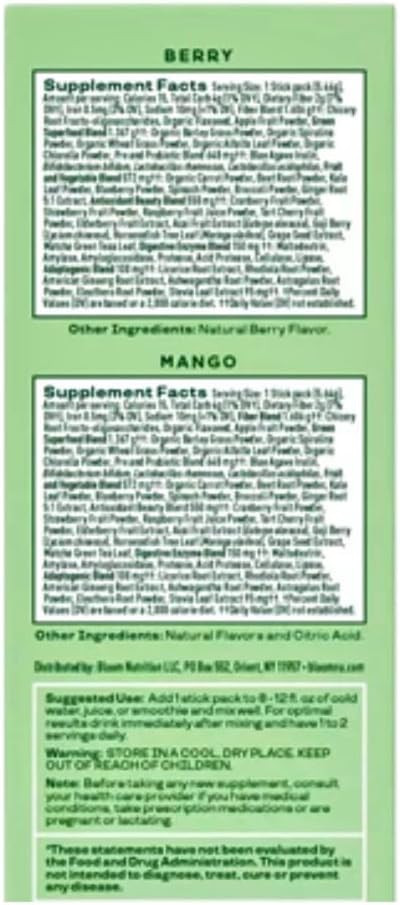 Our Mango Berry Superfood Powder Sticks, which come in a handy 10-count bag, will improve your everyday diet. Completely loaded with nutrient-dense greens and bursting with delicious mango and berry taste, these powder sticks are the ideal complement to any wellness regimen. Strong antioxidants in every stick provide immunological support and a natural energy boost. To quickly and easily provide your body with vital vitamins and minerals, just combine a stick with water or your preferred beverage. These superfood powder sticks match your busy lifestyle, whether you're at home or on the road. With this nutrient-rich blend, you may improve your general well-being and incorporate wellness into your everyday routine. Take a look at our Mango Berry Superfood Powder Sticks now.