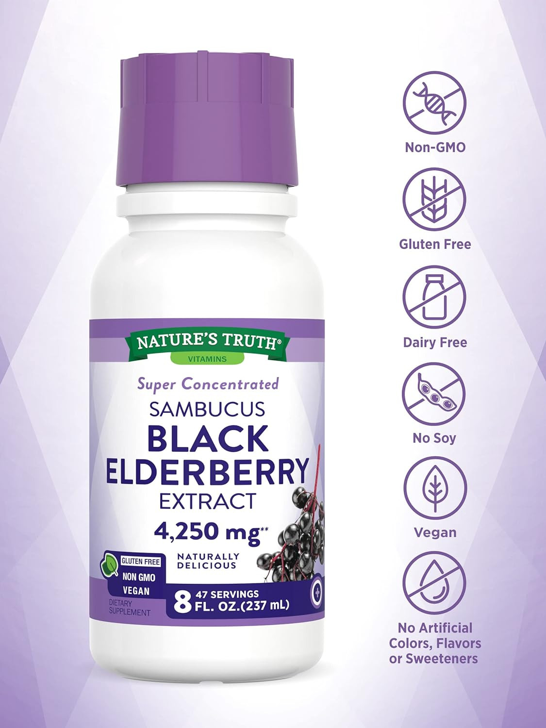 Nature's Truth Black Elderberry (Sambucus nigra) formula is a non-GMO supplement, packaged and lab tested for quality in the USA. Our great tasting, super concentrated extract is now free of common allergens, including gluten, lactose, milk, yeast, wheat, artificial sweetener, and artificial flavor. Adults should consult a medical professional before use if pregnant or taking any medicine. Keep out of reach of kids and babies.