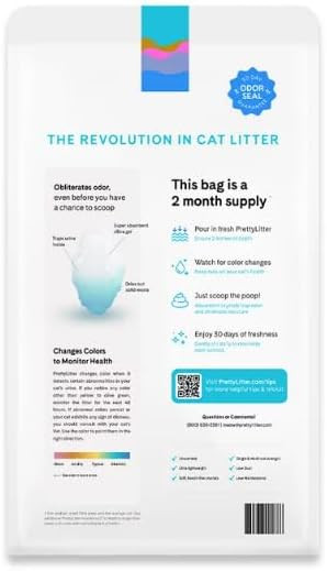 Introducing PrettyLitter, the ultimate innovation in cat litter technology. Our revolutionary non-clumping crystals are designed to provide unbeatable odor control and moisture absorption, catering to both single and multi-cat households. Unlike traditional litters, PrettyLitter's absorbent crystals instantly lock away odors and moisture, ensuring a fresher and more pleasant environment for both you and your feline companions. But that's not all – this game-changing cat litter goes beyond the ordinary. One 8lb. bag of PrettyLitter is all you need to enjoy approximately 2 months of worry-free litter management. No more struggling with heavy bags of litter or frequent trips to the store. Its lightweight nature saves you the hassle and strain, making cat ownership even more enjoyable. But what truly sets PrettyLitter apart is its remarkable health-monitoring feature. Through its innovative color-changing formula, this litter can actually provide insights into your cat's well-being. By detecting changes in urine pH and composition, it's a valuable tool in identifying potential health issues such as urinary tract infections, bladder inflammation, urinary stones, and even the presence of blood in the urine. Your cat's health matters, and PrettyLitter ensures you stay informed. Not only is PrettyLitter's low-dust formula beneficial for cats with asthma, but its super absorbent crystals also eliminate liquids, leaving you with only the task of scooping solid waste. This translates to easy maintenance and less litter wastage, saving you both time and effort. With PrettyLitter, say goodbye to clumping litters that create heavy trash bags and require excessive scooping. Our non-clumping formula guarantees lighter bags and a reduced need for store visits, giving you more quality time with your furry friends. Embrace the future of cat parenting with PrettyLitter – a lightweight, health-conscious solution that allows you to prioritize what truly matters: enjoying a long.