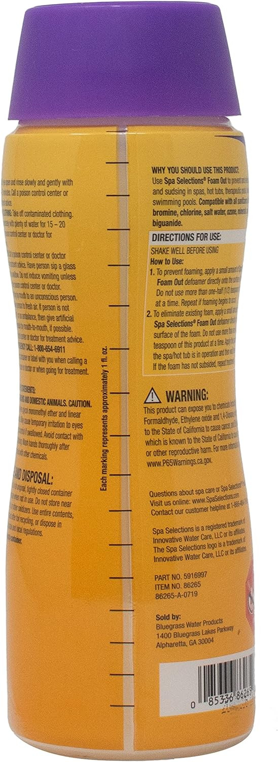 Spas and hot tubs frequently foam and suds, which is easily remedied with Spa Selections Foam Out solution. The turbulent water combined with bathers who have soaps and detergents on their bodies and swimsuits is a common cause of foam. Showering before entering the spa and using Spa Selections Foam Out both aid in reducing foaming. Spa Selections Foam Out is a concentrated, fast-acting spa defoamer designed to prevent and eliminate foaming and sudsing in spas, hot tubs, therapeutic pools, fountains, and swimming pools. About the Company: Spa Selections was designed specifically for use in spas, hot tubs, and jacuzzis. Our water care products are both affordable and powerful enough for the most difficult jobs. We offer a wide range of products at Spa Selections.